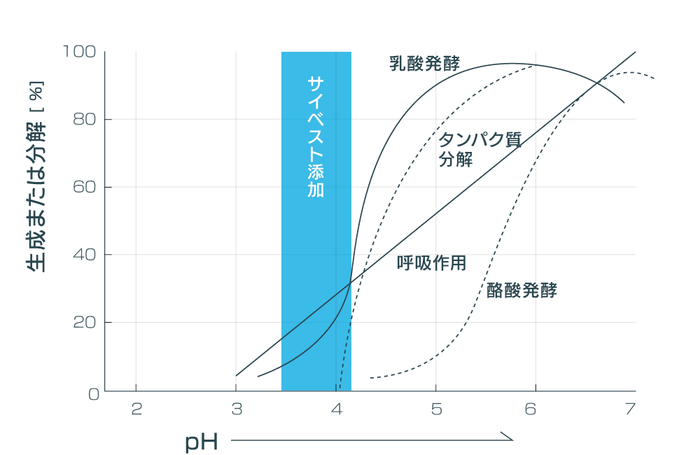 これに対し、加酸法は確実にpHを4.2以下に下げることにより酪酸発酵を抑制することが可能です。よって、サイベスト(ギ酸)は最も理想的な添加剤といえるのです。