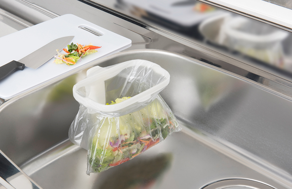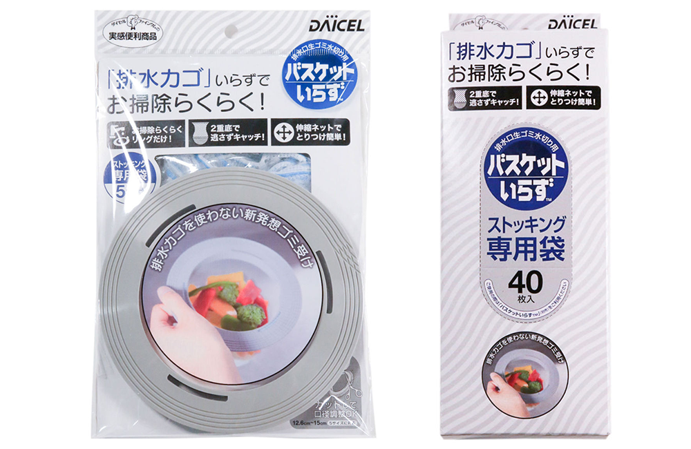 排水カゴの代わりにリングと専用袋を排水口にセットすることで、排水カゴのヌメリ掃除が不要になります。排水口のサイズに合わせてリングの口径調整可能です(12.6~15㎝)。