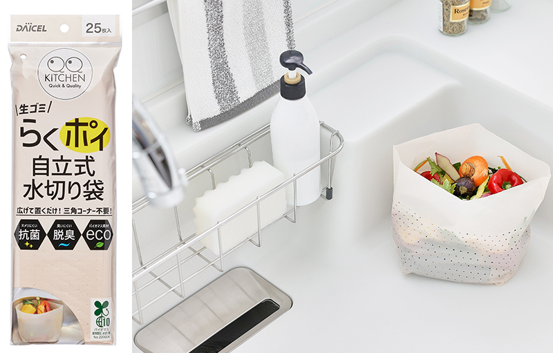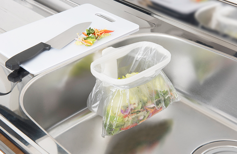 シンクに広げて置くだけの自立する水切り袋です。三角コーナーが不要のため、シンク周りのお掃除の手間が省けます。