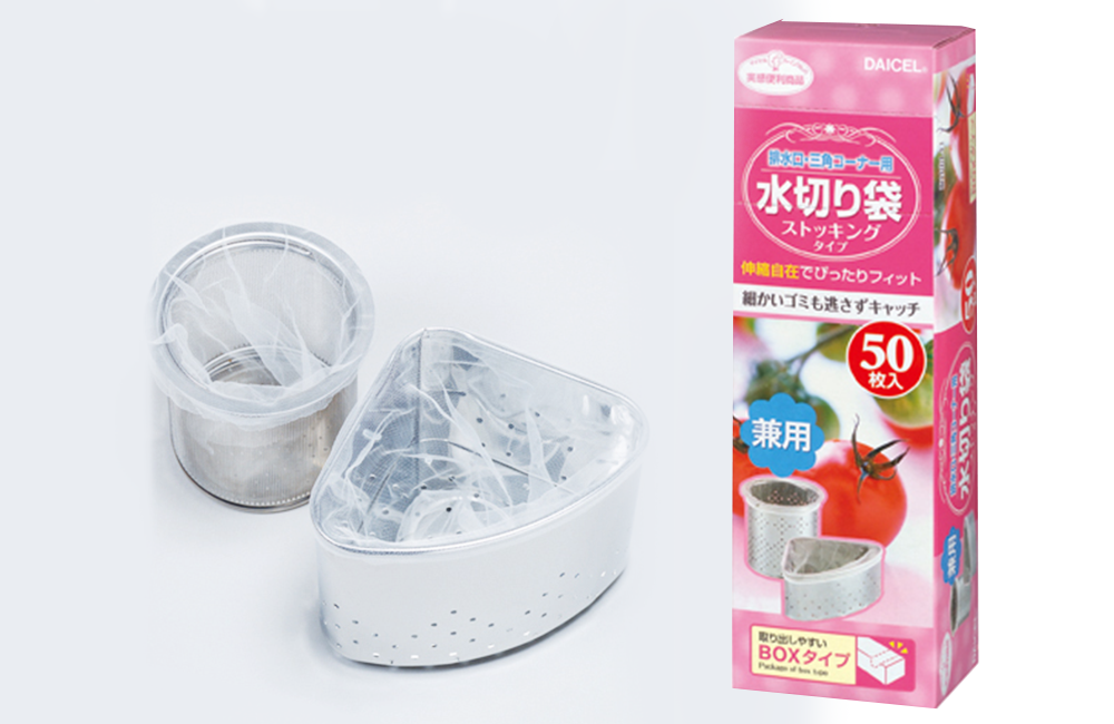 排水口、三角コーナー用の兼用のストッキングタイプの水切り袋。目の細かいストッキングタイプなので、茶ガラなどの細かいゴミも逃しません。