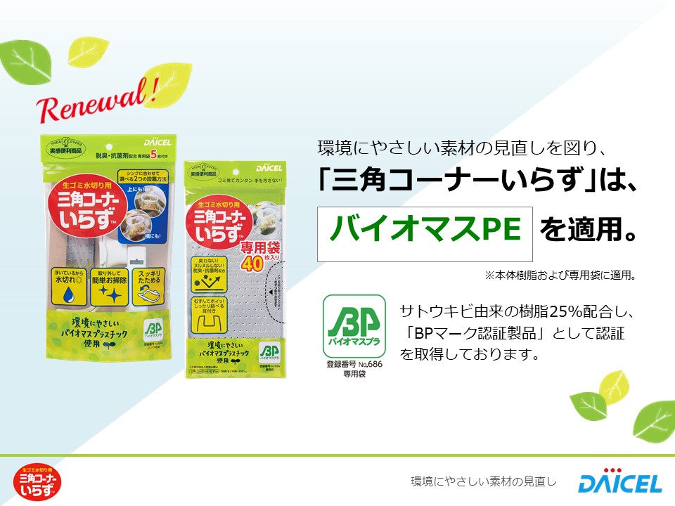 『三角コーナーいらず』にバイオマス樹脂を配合した環境対応品を開発致しました。